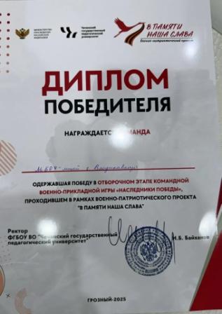 21 октября 2025 года команда МБОУ-лицей приняла участие в выездной просветительской экспедиции «В памяти наша слава». Мероприятие было организовано Чеченским государственным педагогическим университетом в рамках одноименного военно-патриотического проекта. В ходе экспедиции состоялся отборочный этап командной военно-прикладной игры «Наследники Победы», где лицейская команда показала блестящий результат и одержала победу. Теперь наших ребят ждет финальный этап соревнований. Поздравляем команду с этим значительным достижением и желаем удачи в предстоящей финальной игре!