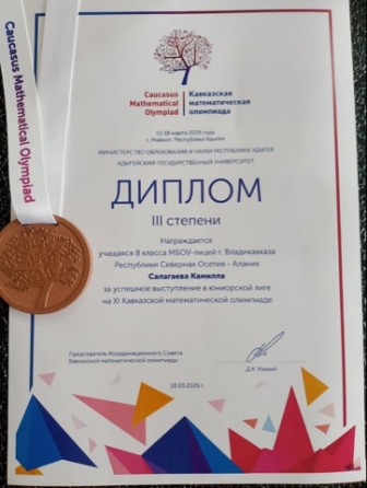 С 13 по 18 марта в городе Майкопе проходила XI Кавказская математическая олимпиада. На сегодняшний день это соревнование является одним из крупнейших международных математических турниров для школьников. В этом году в нем приняли участие более 150 учеников из 13 стран и 21 региона России. Олимпиада проходила на базе Адыгейского государственного университета в очно-дистанционном формате в два тура. Республика Адыгея традиционно встретила участников с большим гостеприимством: для школьников были организованы познавательные и культурные мероприятия. Северную Осетию-Аланию на престижных состязаниях представляла делегация воспитанников Аслана Григорьевича Чшиева в составе 7 участников. Сопровождала команду учитель математики МБОУ‑лицея Мадина Руслановна Бурнацева.По итогам олимпиады делегация республики показала достойный результат. Особо отличилась ученица 8 «А» класса МБОУ‑лицея Камилла Салагаева, которая была награждена дипломом III степени. Поздравляем Камиллу и желаем ей дальнейших успехов!
